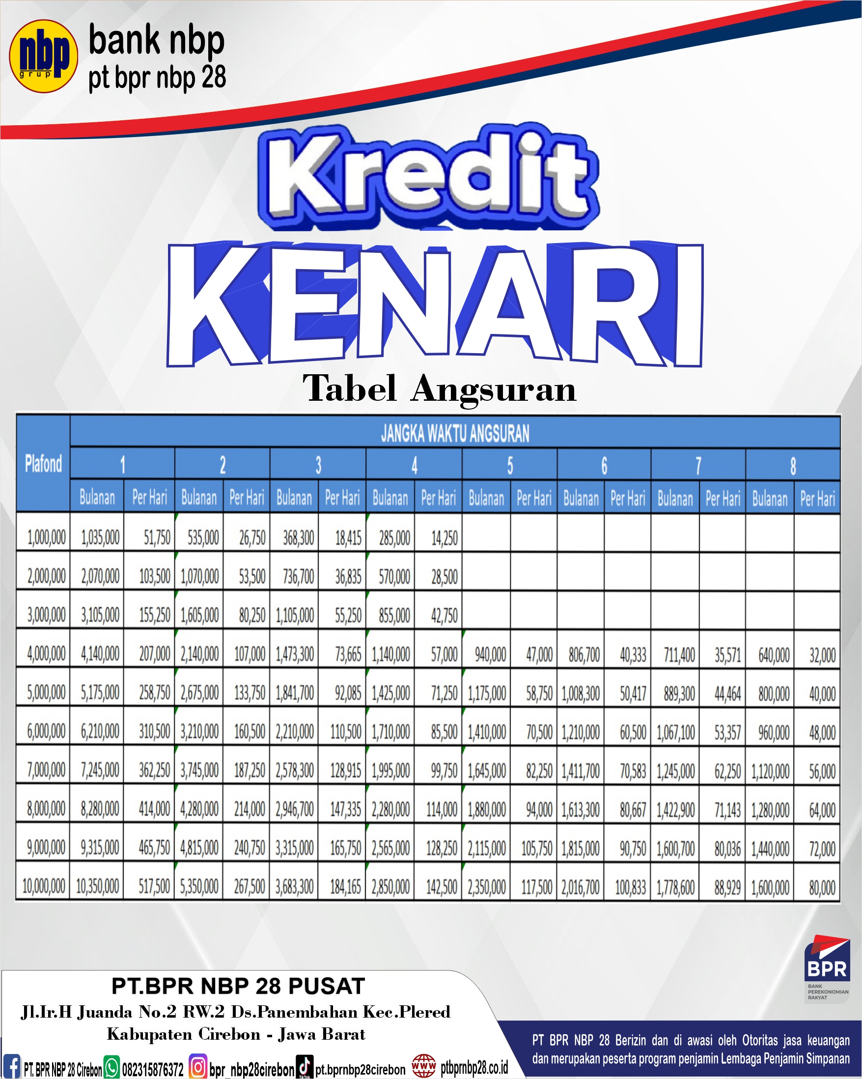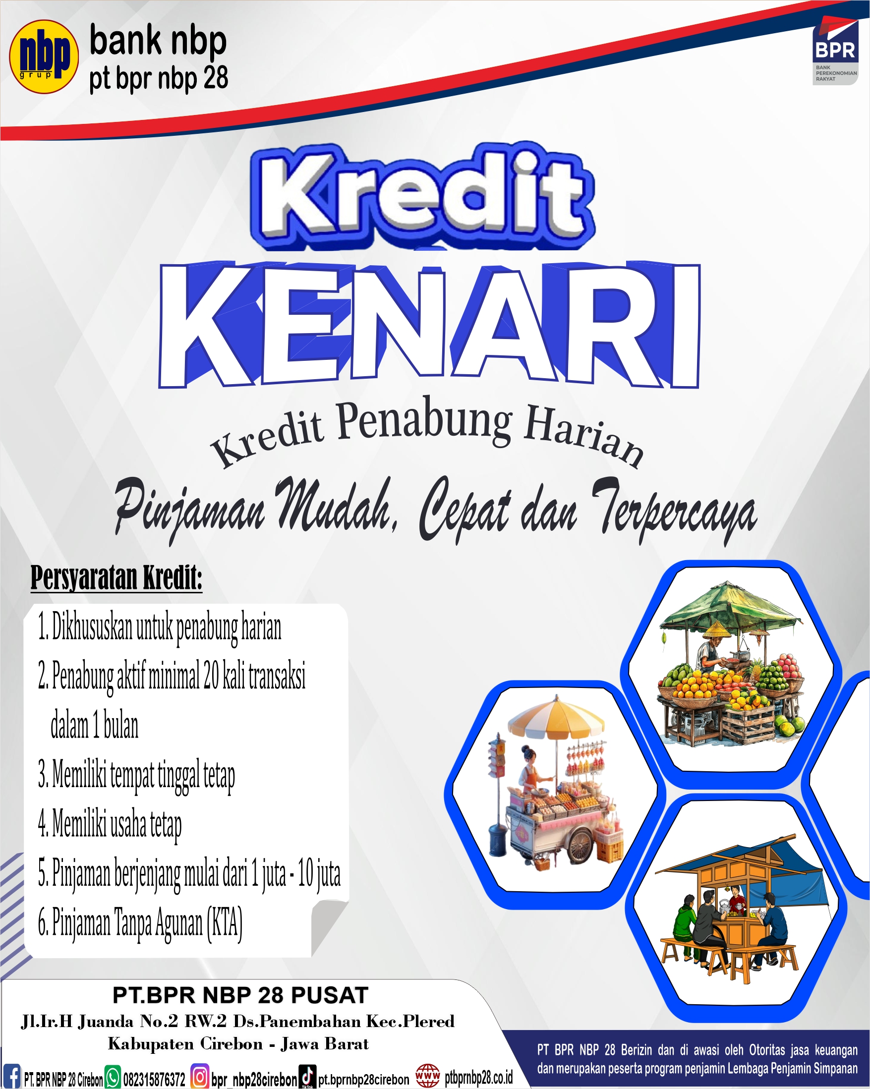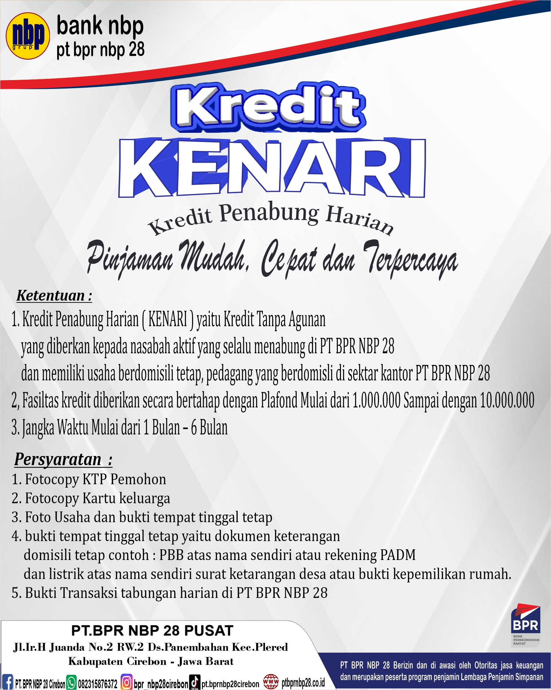 - Kredit Penabung Harian ( KENARI ) yaitu Kredit Tanpa Agunan yang diberkan kepada nasabah aktif yang selalu menabung di PT BPR NBP 28 dan memiliki usaha berdomisili tetap, pedagang yang berdomisli di sektar kantor PT BPR NBP 28